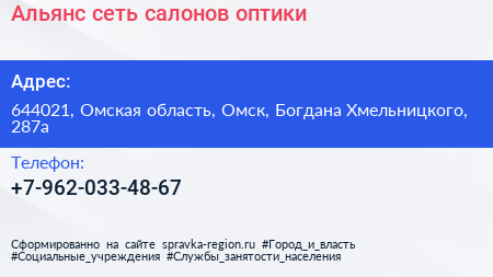Альянс, сеть салонов оптики по адресу 644021, Омская область, Омск, Богдана Хмельницкого, 287а в дальнейшем Организация, размещена в следующих категориях: