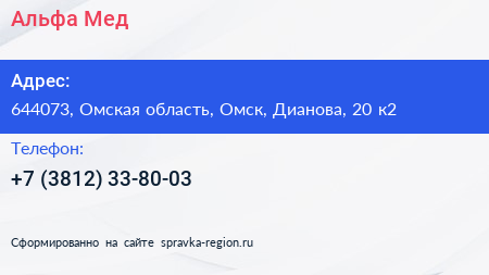 Альфа-Мед по адресу 644073, Омская область, Омск, Дианова, 20 к2 в дальнейшем Организация, размещена в следующих категориях: