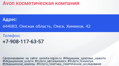 Avon, косметическая компания по адресу 644083, Омская область, Омск, Химиков, 42 в дальнейшем Организация, размещена в следующих категориях: