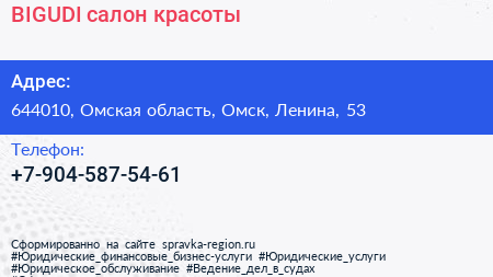 BIGUDI, салон красоты по адресу 644010, Омская область, Омск, Ленина, 53 в дальнейшем Организация, размещена в следующих категориях:
