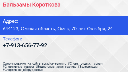 Бальзамы Короткова по адресу 644123, Омская область, Омск, 70 лет Октября, 24 в дальнейшем Организация, размещена в следующих категориях: