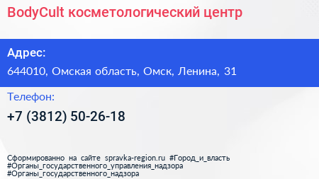 BodyCult, косметологический центр по адресу 644010, Омская область, Омск, Ленина, 31 в дальнейшем Организация, размещена в следующих категориях: