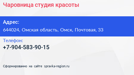 Чаровница, студия красоты по адресу 644024, Омская область, Омск, Почтовая, 33 в дальнейшем Организация, размещена в следующих категориях: