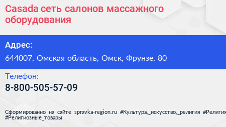 Casada, сеть салонов массажного оборудования по адресу 644007, Омская область, Омск, Фрунзе, 80 в дальнейшем Организация, размещена в следующих категориях: