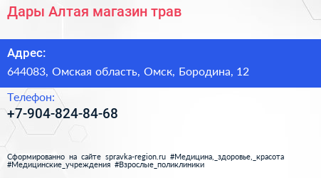 Дары Алтая, магазин трав по адресу 644083, Омская область, Омск, Бородина, 12 в дальнейшем Организация, размещена в следующих категориях: