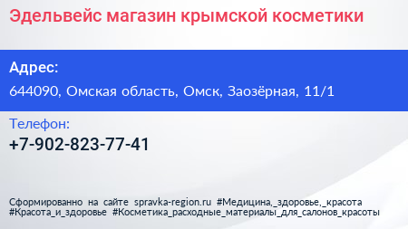 Эдельвейс, магазин крымской косметики по адресу 644090, Омская область, Омск, Заозёрная, 11/1 в дальнейшем Организация, размещена в следующих категориях:
