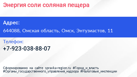 Энергия соли, соляная пещера по адресу 644088, Омская область, Омск, Энтузиастов, 11 в дальнейшем Организация, размещена в следующих категориях: