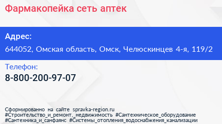 Фармакопейка, сеть аптек по адресу 644052, Омская область, Омск, Челюскинцев 4-я, 119/2 в дальнейшем Организация, размещена в следующих категориях: