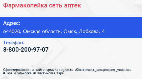 Фармакопейка, сеть аптек по адресу 644020, Омская область, Омск, Лобкова, 4 в дальнейшем Организация, размещена в следующих категориях: