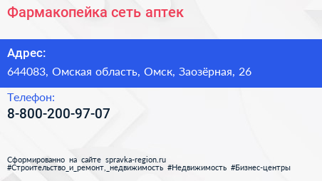 Фармакопейка, сеть аптек по адресу 644083, Омская область, Омск, Заозёрная, 26 в дальнейшем Организация, размещена в следующих категориях: