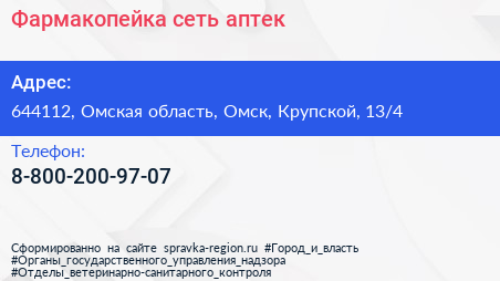 Фармакопейка, сеть аптек по адресу 644112, Омская область, Омск, Крупской, 13/4 в дальнейшем Организация, размещена в следующих категориях:
