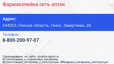 Фармакопейка, сеть аптек по адресу 644013, Омская область, Омск, Завертяева, 28 в дальнейшем Организация, размещена в следующих категориях: