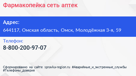 Фармакопейка, сеть аптек по адресу 644117, Омская область, Омск, Молодёжная 3-я, 59 в дальнейшем Организация, размещена в следующих категориях: