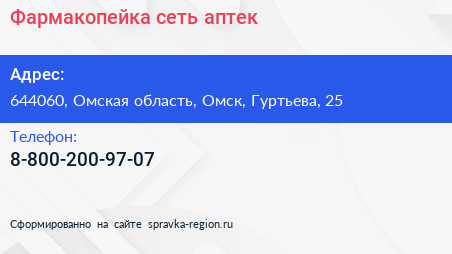 Фармакопейка, сеть аптек по адресу 644060, Омская область, Омск, Гуртьева, 25 в дальнейшем Организация, размещена в следующих категориях: