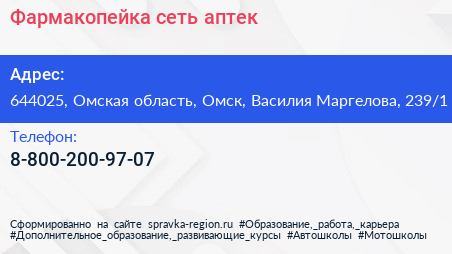 Фармакопейка, сеть аптек по адресу 644025, Омская область, Омск, Василия Маргелова, 239/1 в дальнейшем Организация, размещена в следующих категориях: