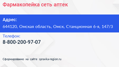 Фармакопейка, сеть аптек по адресу 644120, Омская область, Омск, Станционная 6-я, 147/3 в дальнейшем Организация, размещена в следующих категориях: