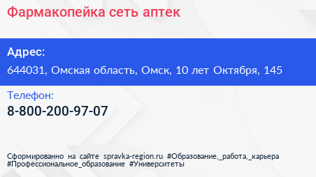 Фармакопейка, сеть аптек по адресу 644031, Омская область, Омск, 10 лет Октября, 145 в дальнейшем Организация, размещена в следующих категориях: