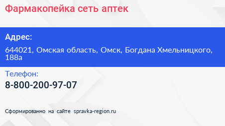 Фармакопейка, сеть аптек по адресу 644021, Омская область, Омск, Богдана Хмельницкого, 188а в дальнейшем Организация, размещена в следующих категориях: