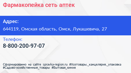 Фармакопейка, сеть аптек по адресу 644119, Омская область, Омск, Лукашевича, 27 в дальнейшем Организация, размещена в следующих категориях: