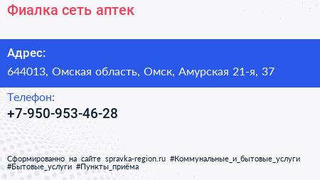 Фиалка, сеть аптек по адресу 644013, Омская область, Омск, Амурская 21-я, 37 в дальнейшем Организация, размещена в следующих категориях:
