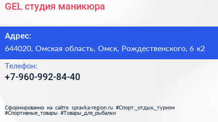GEL, студия маникюра по адресу 644020, Омская область, Омск, Рождественского, 6 к2 в дальнейшем Организация, размещена в следующих категориях: