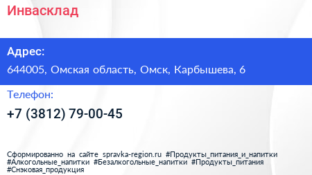 Инвасклад по адресу 644005, Омская область, Омск, Карбышева, 6 в дальнейшем Организация, размещена в следующих категориях: