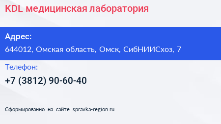 KDL, медицинская лаборатория по адресу 644012, Омская область, Омск, СибНИИСхоз, 7 в дальнейшем Организация, размещена в следующих категориях: