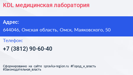 KDL, медицинская лаборатория по адресу 644046, Омская область, Омск, Маяковского, 50 в дальнейшем Организация, размещена в следующих категориях: