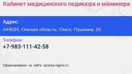 Кабинет медицинского педикюра и маникюра по адресу 644024, Омская область, Омск, Пушкина, 26 в дальнейшем Организация, размещена в следующих категориях: