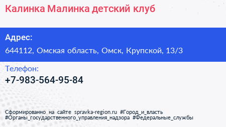 Калинка-Малинка, детский клуб по адресу 644112, Омская область, Омск, Крупской, 13/3 в дальнейшем Организация, размещена в следующих категориях: