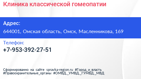 Клиника классической гомеопатии по адресу 644001, Омская область, Омск, Масленникова, 169 в дальнейшем Организация, размещена в следующих категориях:
