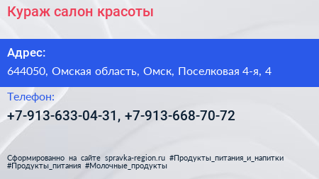 Кураж, салон красоты по адресу 644050, Омская область, Омск, Поселковая 4-я, 4 в дальнейшем Организация, размещена в следующих категориях: