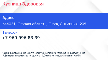 Кузница Здоровья по адресу 644021, Омская область, Омск, 8-я линия, 209 в дальнейшем Организация, размещена в следующих категориях: