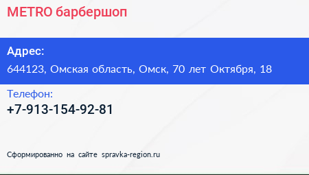 METRO, барбершоп по адресу 644123, Омская область, Омск, 70 лет Октября, 18 в дальнейшем Организация, размещена в следующих категориях: