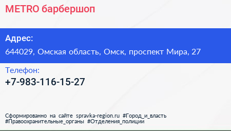 METRO, барбершоп по адресу 644029, Омская область, Омск, проспект Мира, 27 в дальнейшем Организация, размещена в следующих категориях: