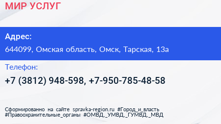 МИР УСЛУГ по адресу 644099, Омская область, Омск, Тарская, 13а в дальнейшем Организация, размещена в следующих категориях: