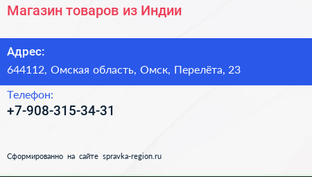 Магазин товаров из Индии по адресу 644112, Омская область, Омск, Перелёта, 23 в дальнейшем Организация, размещена в следующих категориях:
