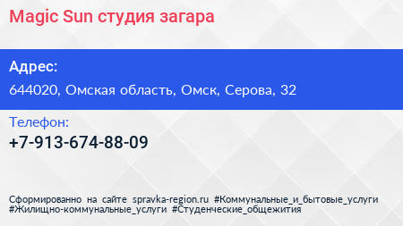 Magic Sun, студия загара по адресу 644020, Омская область, Омск, Серова, 32 в дальнейшем Организация, размещена в следующих категориях: