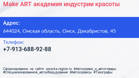 Make-ART, академия индустрии красоты по адресу 644024, Омская область, Омск, Декабристов, 45 в дальнейшем Организация, размещена в следующих категориях: