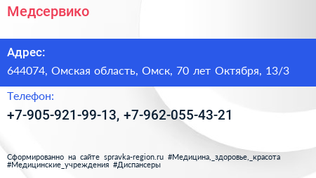Медсервико по адресу 644074, Омская область, Омск, 70 лет Октября, 13/3 в дальнейшем Организация, размещена в следующих категориях: