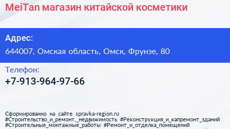 MeiTan, магазин китайской косметики по адресу 644007, Омская область, Омск, Фрунзе, 80 в дальнейшем Организация, размещена в следующих категориях: