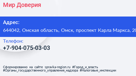 Мир Доверия по адресу 644042, Омская область, Омск, проспект Карла Маркса, 20 в дальнейшем Организация, размещена в следующих категориях: