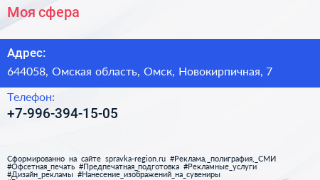 Моя сфера по адресу 644058, Омская область, Омск, Новокирпичная, 7 в дальнейшем Организация, размещена в следующих категориях: