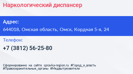 Наркологический диспансер по адресу 644018, Омская область, Омск, Кордная 5-я, 24 в дальнейшем Организация, размещена в следующих категориях: