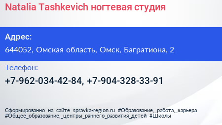Natalia Tashkevich, ногтевая студия по адресу 644052, Омская область, Омск, Багратиона, 2 в дальнейшем Организация, размещена в следующих категориях: