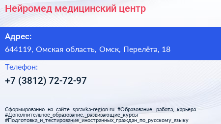 Нейромед, медицинский центр по адресу 644119, Омская область, Омск, Перелёта, 18 в дальнейшем Организация, размещена в следующих категориях: