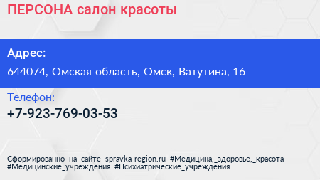 ПЕРСОНА, салон красоты по адресу 644074, Омская область, Омск, Ватутина, 16 в дальнейшем Организация, размещена в следующих категориях: