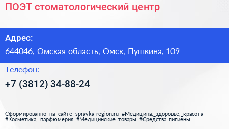 ПОЭТ, стоматологический центр по адресу 644046, Омская область, Омск, Пушкина, 109 в дальнейшем Организация, размещена в следующих категориях: