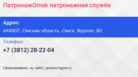 ПатронажOmsk, патронажная служба по адресу 644007, Омская область, Омск, Фрунзе, 80 в дальнейшем Организация, размещена в следующих категориях:
