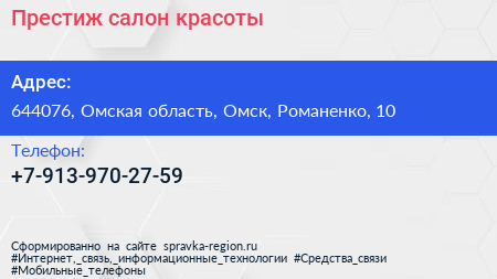 Престиж, салон красоты по адресу 644076, Омская область, Омск, Романенко, 10 в дальнейшем Организация, размещена в следующих категориях: